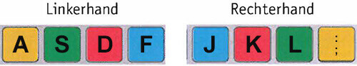 Misschien heb je voor deze typecursus een toetsenbord met gekleurde toetsen gekregen. De kleuren geven de bewegingsbaan aan.