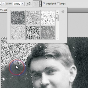 De hiervoor besproken kloongereedschappen vallen in het niet bij het Retoucheerpenseel (Healing Brush Tool). U schildert met bemonsterde pixels, maar hier houdt de vergelijking met de beide kloonstempels op. Het Retoucheerpenseel kijkt tijdens het beschilderen van een beschadigd gebied namelijk ook naar de eigenschappen van het gebied waar u overheen schildert. Er wordt rekening gehouden met de bestaande structuur, tint en belichting. De nieuwe pixels die u schildert, sluiten hierdoor naadloos aan bij de bestaande pixels.