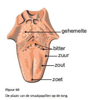 Er bestaan vier soorten smaakpapillen die gespecialiseerd zijn in een viertal smaakkwaliteiten. Deze soorten papillen liggen op verschillende locaties op de tong (zie figuur 60):