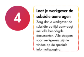 Als werknemer kun je zelf geen subsidie aanvragen. Je werkgever doet de aanvraag voor jou. Bespreek de mogelijkheden en zorg dat je werkgever zich op tijd aanmeldt.